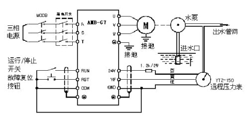 經(jīng)過對整個系統(tǒng)的分析,變頻器我們選用安邦信公司生產(chǎn)的AMB-100系列的變頻器,該系列是適應(yīng)多種工況的高品質(zhì)、低噪聲、多功能通用變頻調(diào)速器。內(nèi)置PID調(diào)節(jié)器,閉環(huán)控制系統(tǒng)結(jié)構(gòu)簡單。壓力表我們選用YTZ-150電位器式遠程壓力表,安裝在水泵的出水管上,該壓力表適用于一般壓力表適用的工作環(huán)境場所,既可直觀測出壓力值,又可以輸出相應(yīng)的電信號,輸出的電信號傳至遠端的變頻器。壓力表有紅、黃、藍三根引出線。